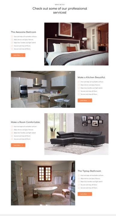 Nút CTA (Call to Action) “Book A Cleaning”, “Learn More” hiển thị liên tục và dễ thấy.